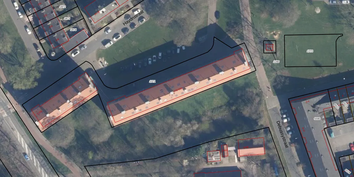 Het perceel waarop Haydnstraat 37 staat heeft een oppervlakte van 2605 m². Dit is een zeer groot perceel. De perceeloppervlakte wordt geregistreerd door het Kadaster. Gedetailleerde informatie over de maten van dit perceel kunt u vinden in het rapport Kadastrale kaart met maatvoering van Haydnstraat 37.
