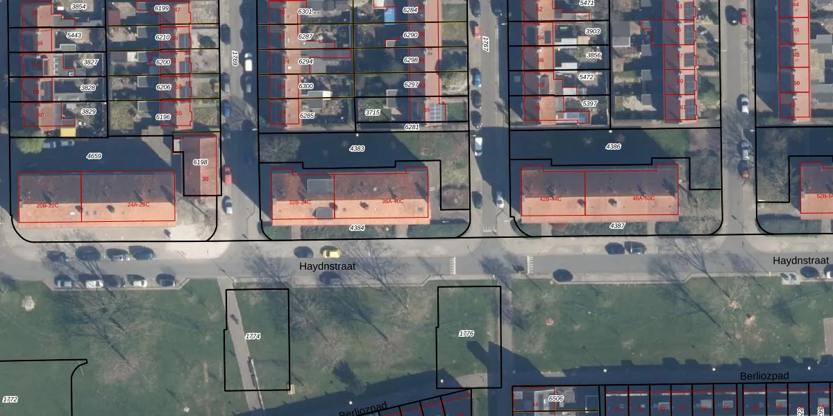Het perceel waarop Haydnstraat 40-C staat heeft een oppervlakte van 815 m². Dit is een groot perceel. De perceeloppervlakte wordt geregistreerd door het Kadaster. Gedetailleerde informatie over de maten van dit perceel kunt u vinden in het rapport Kadastrale kaart met maatvoering van Haydnstraat 40-C.