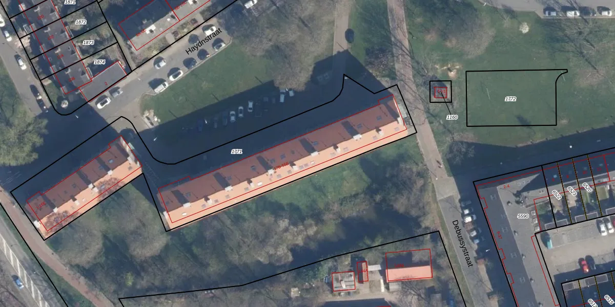 Het perceel waarop Haydnstraat 41 staat heeft een oppervlakte van 2605 m². Dit is een zeer groot perceel. De perceeloppervlakte wordt geregistreerd door het Kadaster. Gedetailleerde informatie over de maten van dit perceel kunt u vinden in het rapport Kadastrale kaart met maatvoering van Haydnstraat 41.
