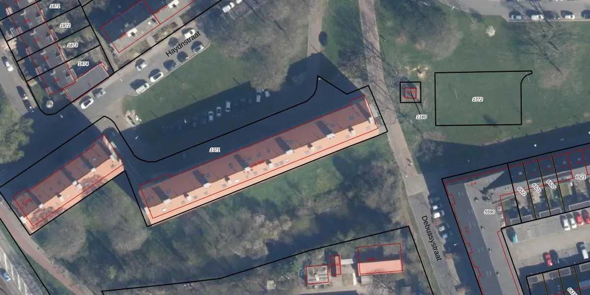 Het perceel waarop Haydnstraat 43 staat heeft een oppervlakte van 2605 m². Dit is een zeer groot perceel. De perceeloppervlakte wordt geregistreerd door het Kadaster. Gedetailleerde informatie over de maten van dit perceel kunt u vinden in het rapport Kadastrale kaart met maatvoering van Haydnstraat 43.