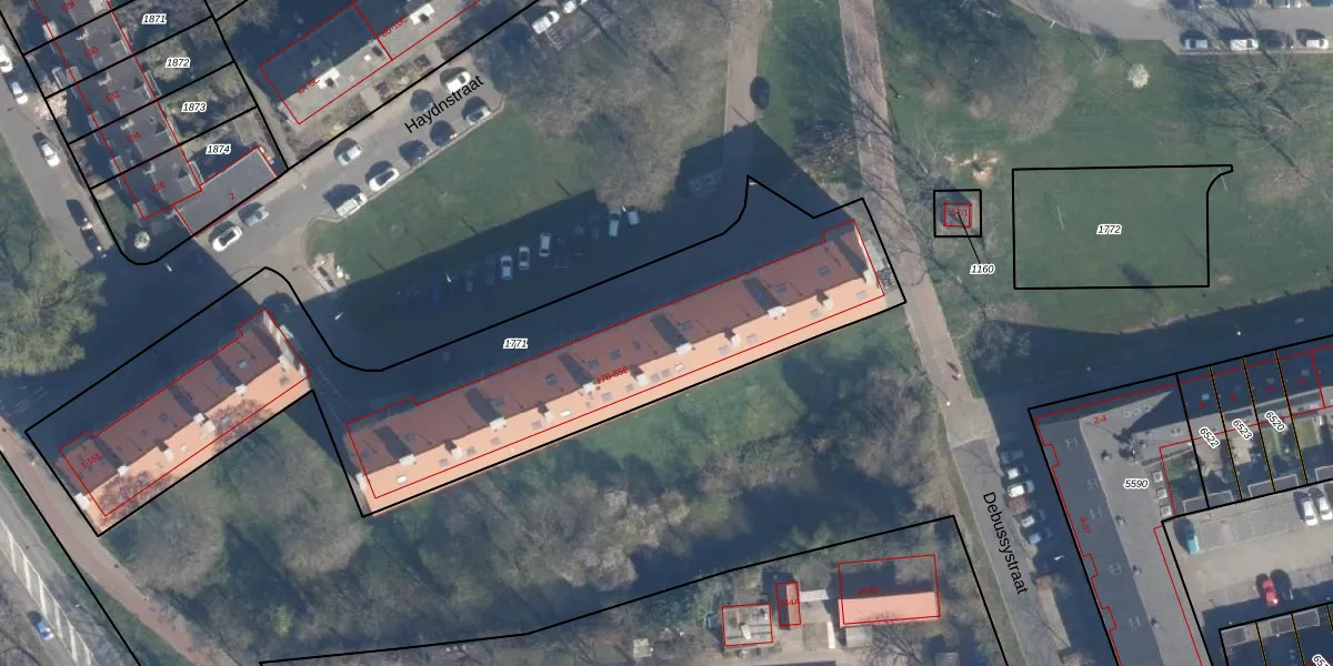 Het perceel waarop Haydnstraat 45-E staat heeft een oppervlakte van 2605 m². Dit is een zeer groot perceel. De perceeloppervlakte wordt geregistreerd door het Kadaster. Gedetailleerde informatie over de maten van dit perceel kunt u vinden in het rapport Kadastrale kaart met maatvoering van Haydnstraat 45-E.