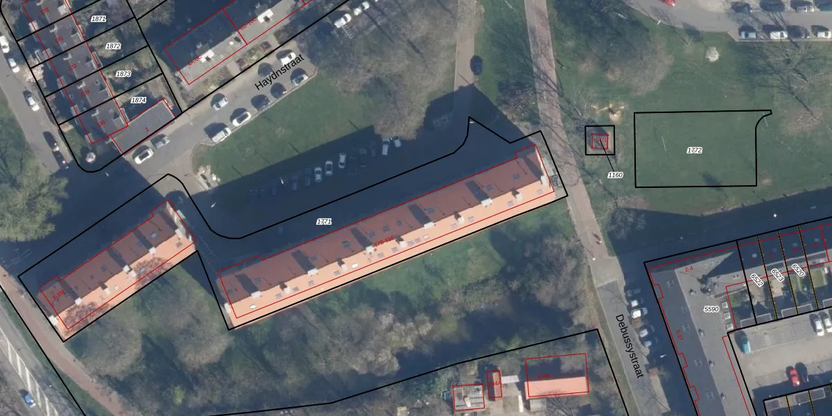 Het perceel waarop Haydnstraat 45-C staat heeft een oppervlakte van 2605 m². Dit is een zeer groot perceel. De perceeloppervlakte wordt geregistreerd door het Kadaster. Gedetailleerde informatie over de maten van dit perceel kunt u vinden in het rapport Kadastrale kaart met maatvoering van Haydnstraat 45-C.