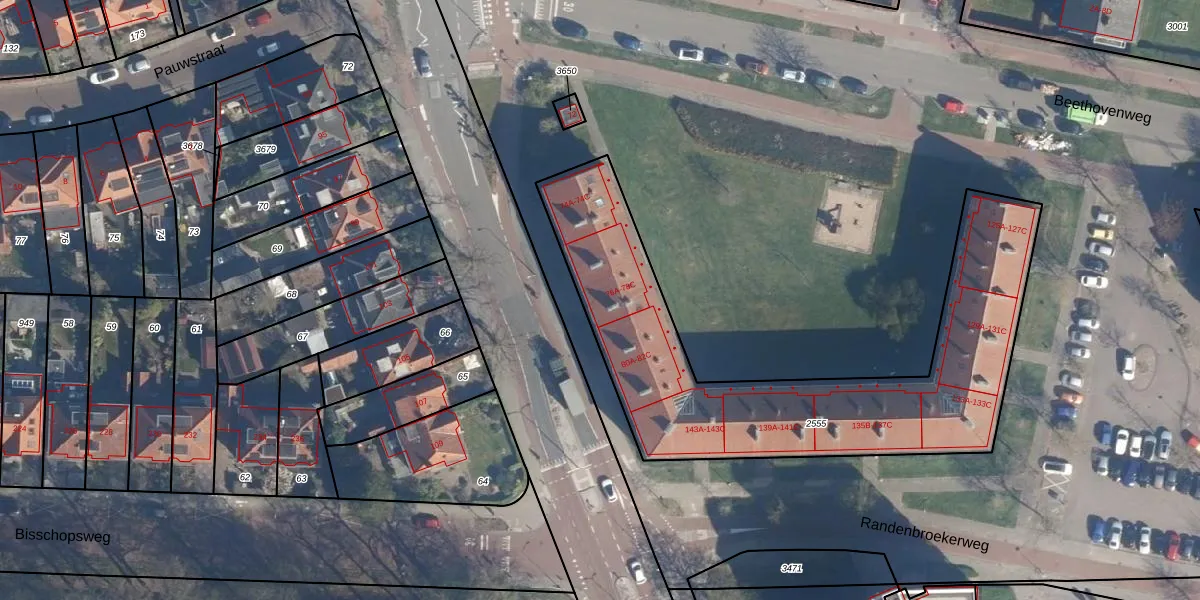 Het perceel waarop het adres ligt is AMF00-G-2555. De afkorting 'AMF00' staat voor kadastrale gemeente Amersfoort. Het perceel is met 1685 m² relatief groot. Het gemiddelde ligt in de kadastrale gemeente Amersfoort op 959,8 m². De grootste perceeloppervlakte in de kadastrale gemeente is 1,12 km². De kleinste oppervlakte bedraagt 0 m². Op het perceel zijn 44 adressen aanwezig. De huidige grenzen van het perceel zijn digitaal in de Basisregistratie Kadaster (BRK) geregistreerd op 09-02-2004.