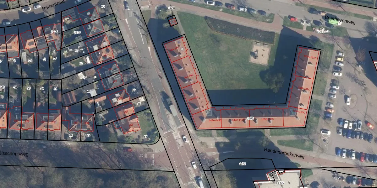 Het adres is gelegen op perceel 2555 in de sectie G en de kadastrale gemeente Amersfoort. De kadastrale aanduiding is aldus AMF00-G-2555. Het perceel is met 1685 m² relatief groot. Het gemiddelde ligt in de kadastrale gemeente Amersfoort op 959,94 m². De grootste perceeloppervlakte in de kadastrale gemeente is 1,12 km². De kleinste oppervlakte bedraagt 0 m². Op het perceel liggen in totaal 44 adressen. De huidige grenzen van het perceel zijn digitaal in de Basisregistratie Kadaster (BRK) geregistreerd op 09-02-2004.