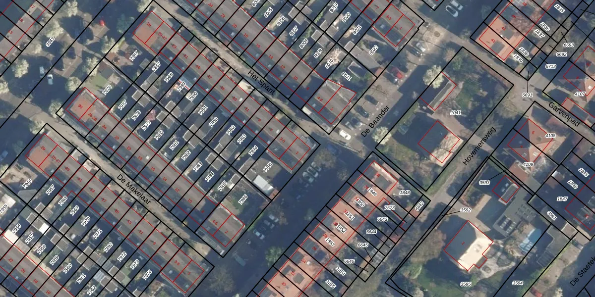 Het perceel waarop Het Spant 1 staat heeft een oppervlakte van 319 m². Dit is een groot perceel. De perceeloppervlakte wordt geregistreerd door het Kadaster. Gedetailleerde informatie over de maten van dit perceel kunt u vinden in het rapport Kadastrale kaart met maatvoering van Het Spant 1.