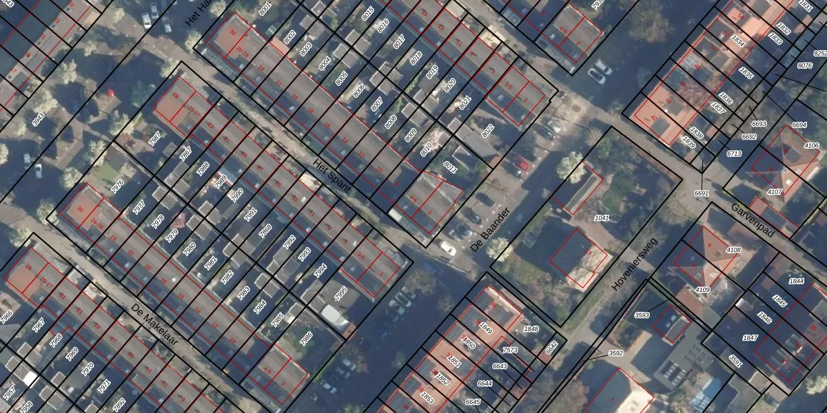 Het perceel waarop Het Spant 4 staat heeft een oppervlakte van 319 m². Dit is een groot perceel. De perceeloppervlakte wordt geregistreerd door het Kadaster. Gedetailleerde informatie over de maten van dit perceel kunt u vinden in het rapport Kadastrale kaart met maatvoering van Het Spant 4.