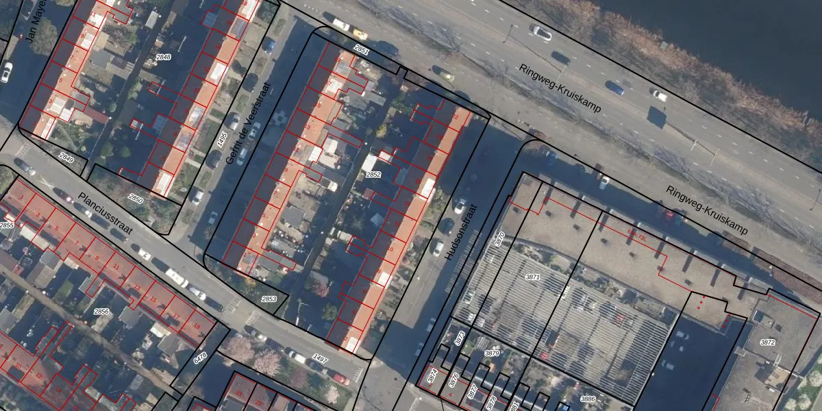Het perceel waarop Hudsonstraat 14 staat heeft een oppervlakte van 3045 m². Dit is een zeer groot perceel. De perceeloppervlakte wordt geregistreerd door het Kadaster. Gedetailleerde informatie over de maten van dit perceel kunt u vinden in het rapport Kadastrale kaart met maatvoering van Hudsonstraat 14.