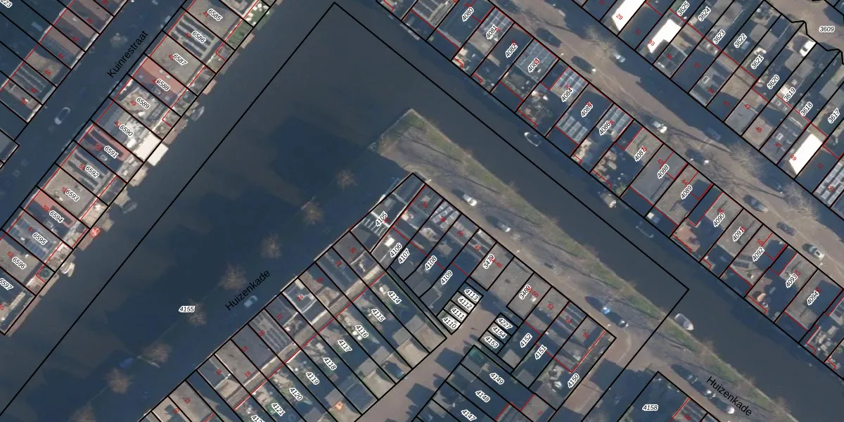 Huizenkade 36 is gelegen op kadastraal perceel HLD02B4106. Deze kadastrale aanduiding is uniek en wordt gebruikt door het Kadaster om eigendomsrechten en andere zakelijke rechten vast te leggen. Het perceel maakt onderdeel uit van de kadastrale gemeente Hoogland.