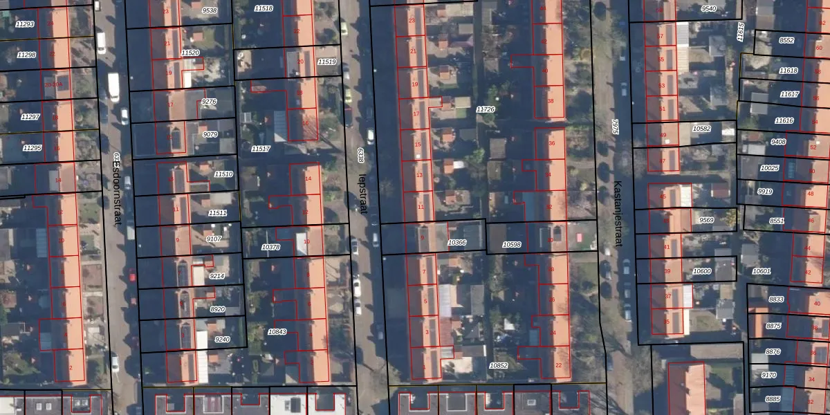 Het perceel waarop Iepstraat 11 staat heeft een oppervlakte van 2910 m². Dit is een zeer groot perceel. De perceeloppervlakte wordt geregistreerd door het Kadaster. Gedetailleerde informatie over de maten van dit perceel kunt u vinden in het rapport Kadastrale kaart met maatvoering van Iepstraat 11.