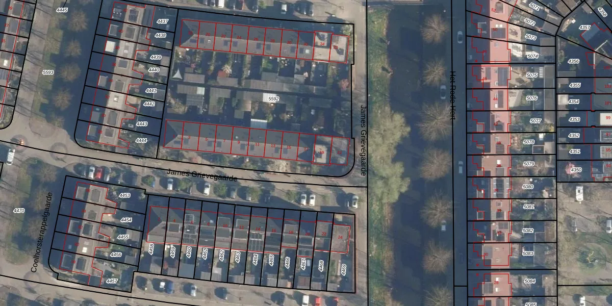 Het perceel waarop James Grievegaarde 17 staat heeft een oppervlakte van 3025 m². Dit is een zeer groot perceel. De perceeloppervlakte wordt geregistreerd door het Kadaster. Gedetailleerde informatie over de maten van dit perceel kunt u vinden in het rapport Kadastrale kaart met maatvoering van James Grievegaarde 17.