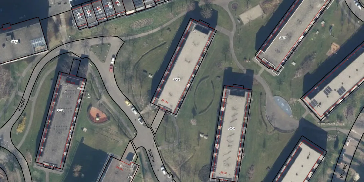 Het perceel waarop Karper 82 staat heeft een oppervlakte van 869 m². Dit is een groot perceel. De perceeloppervlakte wordt geregistreerd door het Kadaster. Gedetailleerde informatie over de maten van dit perceel kunt u vinden in het rapport Kadastrale kaart met maatvoering van Karper 82.