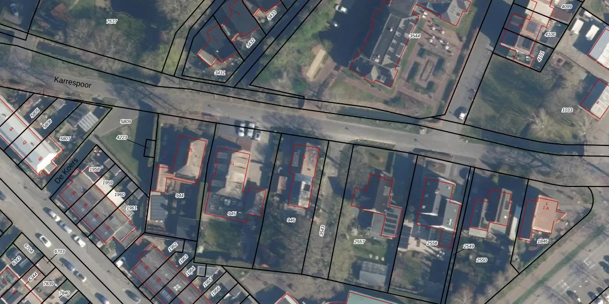 Karrespoor 9 is gelegen op kadastraal perceel AMF00O946. Deze kadastrale aanduiding is uniek en wordt gebruikt door het Kadaster om eigendomsrechten en andere zakelijke rechten vast te leggen. Het perceel maakt onderdeel uit van de kadastrale gemeente Amersfoort.