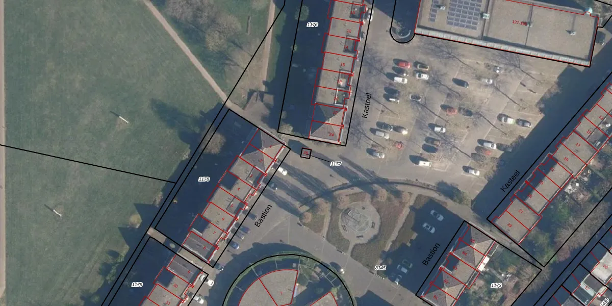 Het perceel waarop Kasteel 26 staat heeft een oppervlakte van 9 m². Dit is een klein perceel. De perceeloppervlakte wordt geregistreerd door het Kadaster. Gedetailleerde informatie over de maten van dit perceel kunt u vinden in het rapport Kadastrale kaart met maatvoering van Kasteel 26.