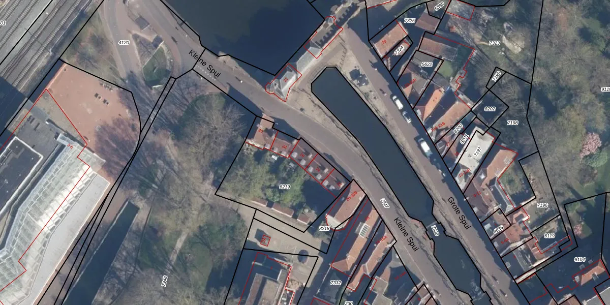 Het perceel waarop Kleine Spui 26 staat heeft een oppervlakte van 900 m². Dit is een groot perceel. De perceeloppervlakte wordt geregistreerd door het Kadaster. Gedetailleerde informatie over de maten van dit perceel kunt u vinden in het rapport Kadastrale kaart met maatvoering van Kleine Spui 26.