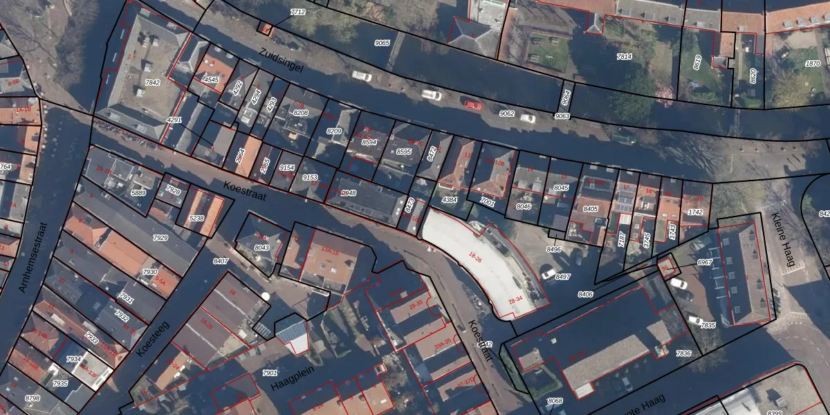 Koestraat 16-B is gelegen op kadastraal perceel AMF00E8473. Deze kadastrale aanduiding is uniek en wordt gebruikt door het Kadaster om eigendomsrechten en andere zakelijke rechten vast te leggen. Het perceel maakt onderdeel uit van de kadastrale gemeente Amersfoort.