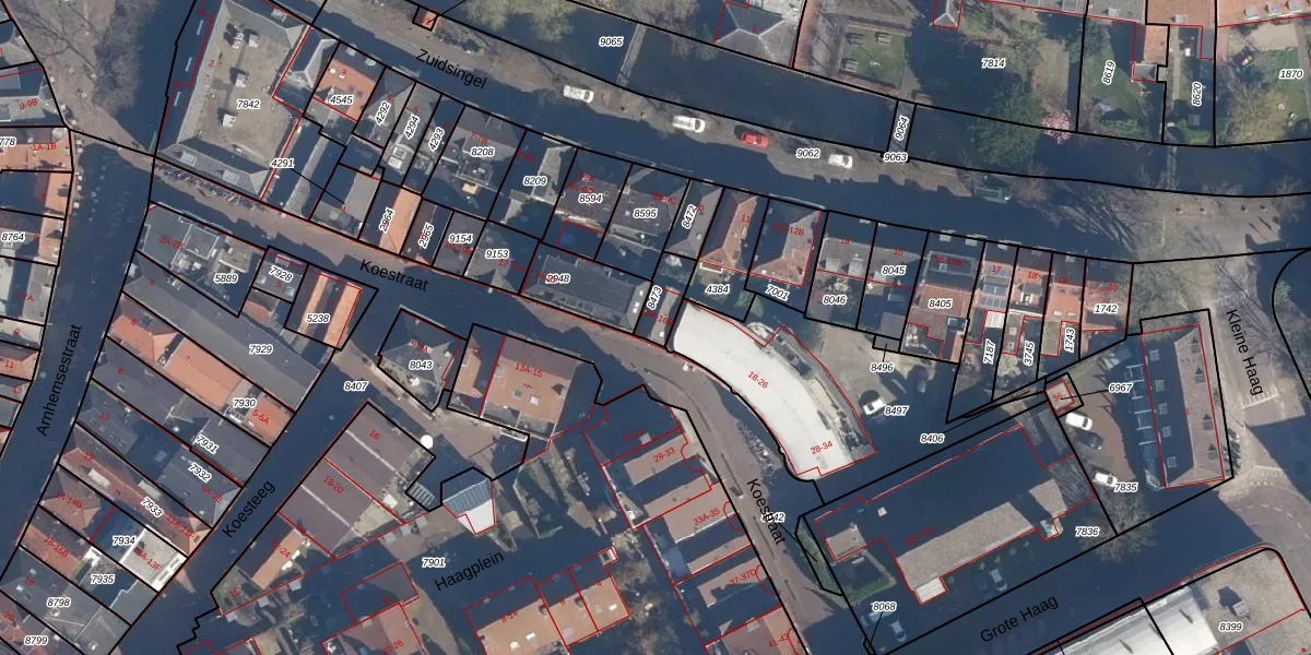 Het perceel waarop Koestraat 16-A staat heeft een oppervlakte van 76 m². Dit is een klein perceel. De perceeloppervlakte wordt geregistreerd door het Kadaster. Gedetailleerde informatie over de maten van dit perceel kunt u vinden in het rapport Kadastrale kaart met maatvoering van Koestraat 16-A.