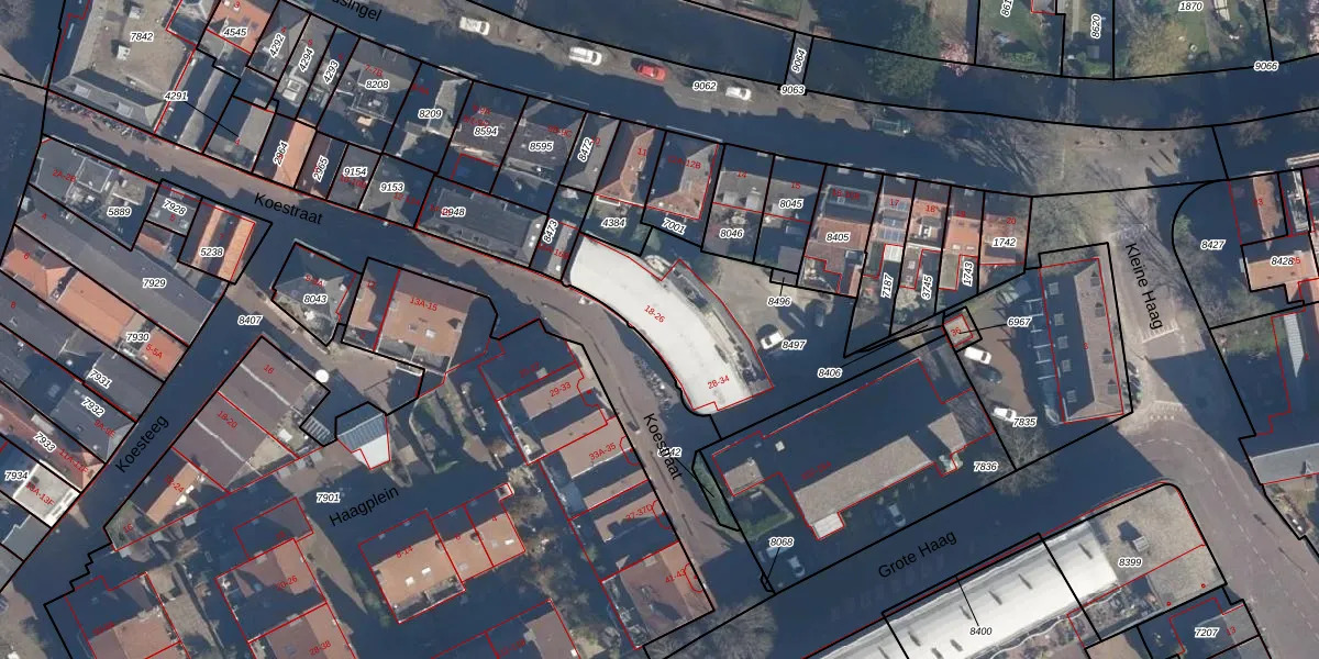 Het perceel waarop Koestraat 24 staat heeft een oppervlakte van 802 m². Dit is een groot perceel. De perceeloppervlakte wordt geregistreerd door het Kadaster. Gedetailleerde informatie over de maten van dit perceel kunt u vinden in het rapport Kadastrale kaart met maatvoering van Koestraat 24.