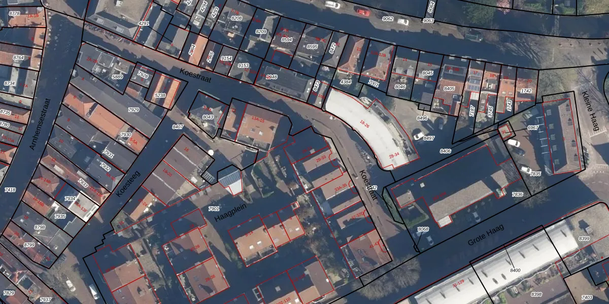 Het perceel waarop Koestraat 25 staat heeft een oppervlakte van 5428 m². Dit is een zeer groot perceel. De perceeloppervlakte wordt geregistreerd door het Kadaster. Gedetailleerde informatie over de maten van dit perceel kunt u vinden in het rapport Kadastrale kaart met maatvoering van Koestraat 25.