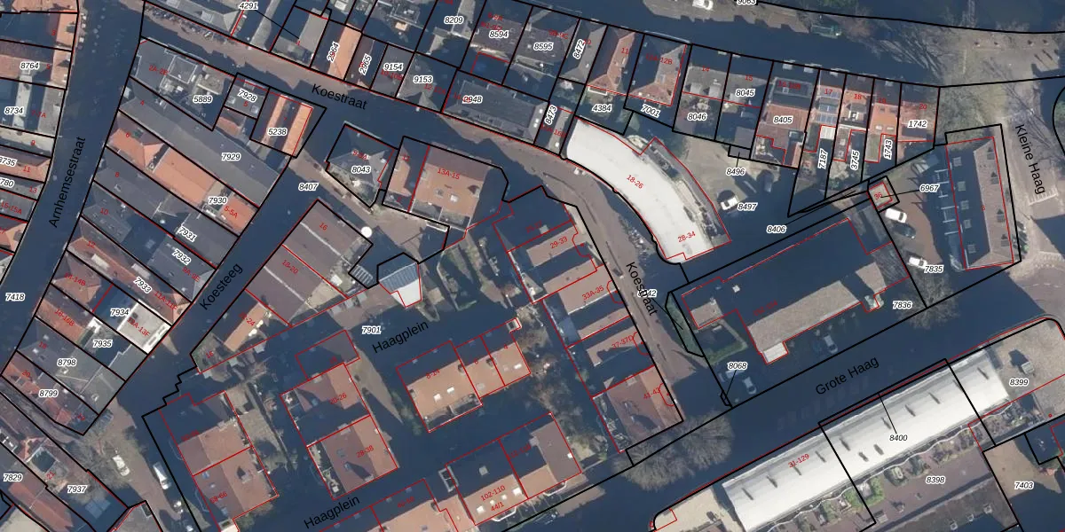 Het perceel waarop Koestraat 29-D staat heeft een oppervlakte van 5428 m². Dit is een zeer groot perceel. De perceeloppervlakte wordt geregistreerd door het Kadaster. Gedetailleerde informatie over de maten van dit perceel kunt u vinden in het rapport Kadastrale kaart met maatvoering van Koestraat 29-D.