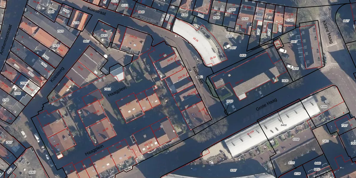 Het perceel waarop Koestraat 33-A staat heeft een oppervlakte van 5428 m². Dit is een zeer groot perceel. De perceeloppervlakte wordt geregistreerd door het Kadaster. Gedetailleerde informatie over de maten van dit perceel kunt u vinden in het rapport Kadastrale kaart met maatvoering van Koestraat 33-A.
