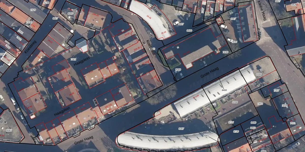 Het perceel waarop Koestraat 41 staat heeft een oppervlakte van 5428 m². Dit is een zeer groot perceel. De perceeloppervlakte wordt geregistreerd door het Kadaster. Gedetailleerde informatie over de maten van dit perceel kunt u vinden in het rapport Kadastrale kaart met maatvoering van Koestraat 41.