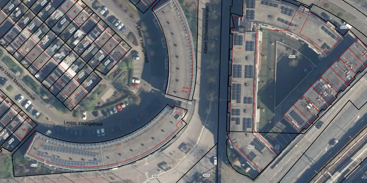 Lester Youngstraat 40 is gelegen op kadastraal perceel AMF00K4174. Deze kadastrale aanduiding is uniek en wordt gebruikt door het Kadaster om eigendomsrechten en andere zakelijke rechten vast te leggen. Het perceel maakt onderdeel uit van de kadastrale gemeente Amersfoort.