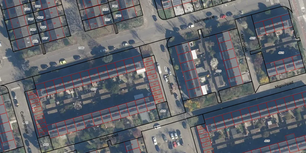 Het perceel waarop Manonstraat 1-5 staat heeft een oppervlakte van 4108 m². Dit is een zeer groot perceel. De perceeloppervlakte wordt geregistreerd door het Kadaster. Gedetailleerde informatie over de maten van dit perceel kunt u vinden in het rapport Kadastrale kaart met maatvoering van Manonstraat 1-5.