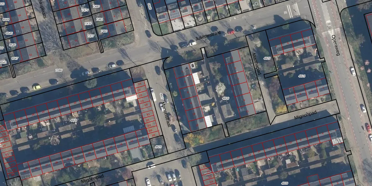 Het perceel waarop Manonstraat 6 staat heeft een oppervlakte van 1741 m². Dit is een zeer groot perceel. De perceeloppervlakte wordt geregistreerd door het Kadaster. Gedetailleerde informatie over de maten van dit perceel kunt u vinden in het rapport Kadastrale kaart met maatvoering van Manonstraat 6.
