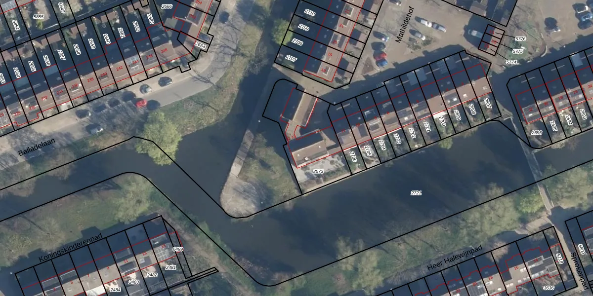 Het perceel waarop Mathildehof 15 staat heeft een oppervlakte van 612 m². Dit is een groot perceel. De perceeloppervlakte wordt geregistreerd door het Kadaster. Gedetailleerde informatie over de maten van dit perceel kunt u vinden in het rapport Kadastrale kaart met maatvoering van Mathildehof 15.