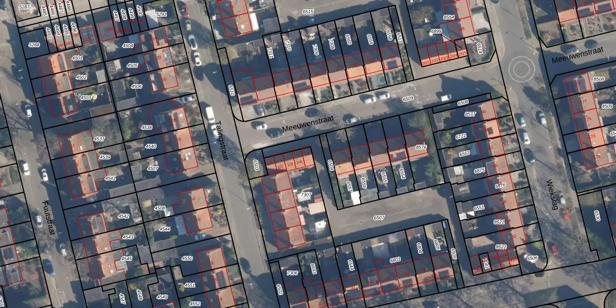 Het perceel waarop Meeuwenstraat 1-5 staat heeft een oppervlakte van 821 m². Dit is een groot perceel. De perceeloppervlakte wordt geregistreerd door het Kadaster. Gedetailleerde informatie over de maten van dit perceel kunt u vinden in het rapport Kadastrale kaart met maatvoering van Meeuwenstraat 1-5.
