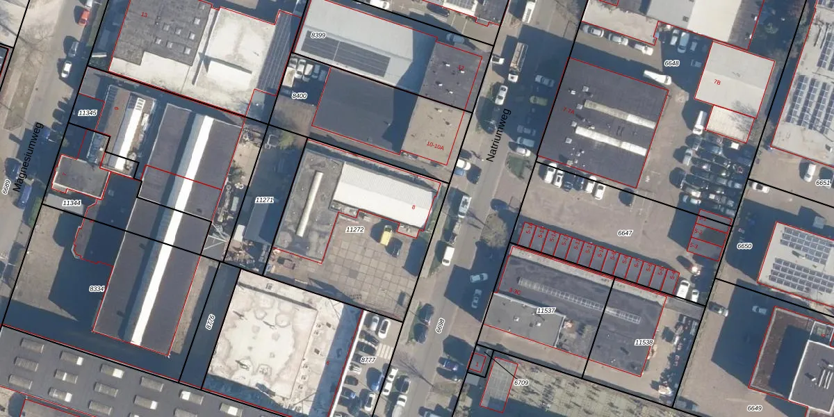 Het perceel waarop Natriumweg 8 staat heeft een oppervlakte van 1250 m². Dit is een zeer groot perceel. De perceeloppervlakte wordt geregistreerd door het Kadaster. Gedetailleerde informatie over de maten van dit perceel kunt u vinden in het rapport Kadastrale kaart met maatvoering van Natriumweg 8.