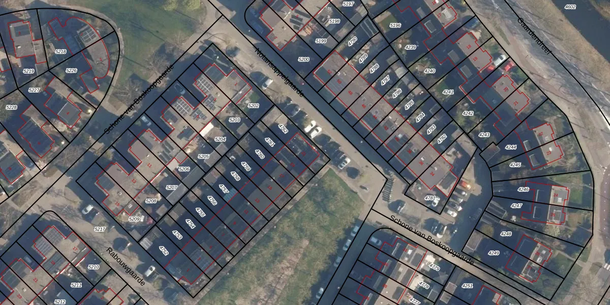 Het perceel waarop Notarisappelgaarde 21 staat heeft een oppervlakte van 180 m². Dit is een middelgroot perceel. De perceeloppervlakte wordt geregistreerd door het Kadaster. Gedetailleerde informatie over de maten van dit perceel kunt u vinden in het rapport Kadastrale kaart met maatvoering van Notarisappelgaarde 21.