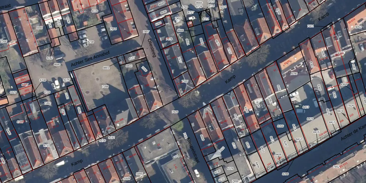 Het perceel waarop Oliesteeg 1-A staat heeft een oppervlakte van 105 m². Dit is een middelgroot perceel. De perceeloppervlakte wordt geregistreerd door het Kadaster. Gedetailleerde informatie over de maten van dit perceel kunt u vinden in het rapport Kadastrale kaart met maatvoering van Oliesteeg 1-A.