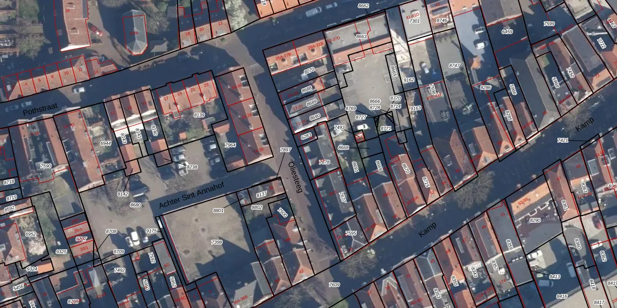 Het perceel waarop Oliesteeg 7-B staat heeft een oppervlakte van 142 m². Dit is een middelgroot perceel. De perceeloppervlakte wordt geregistreerd door het Kadaster. Gedetailleerde informatie over de maten van dit perceel kunt u vinden in het rapport Kadastrale kaart met maatvoering van Oliesteeg 7-B.