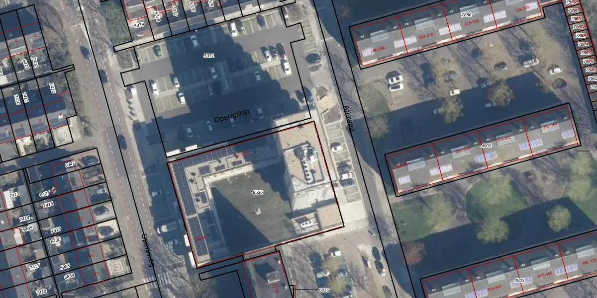 Het perceel waarop Operaplein 86 staat heeft een oppervlakte van 1905 m². Dit is een zeer groot perceel. De perceeloppervlakte wordt geregistreerd door het Kadaster. Gedetailleerde informatie over de maten van dit perceel kunt u vinden in het rapport Kadastrale kaart met maatvoering van Operaplein 86.