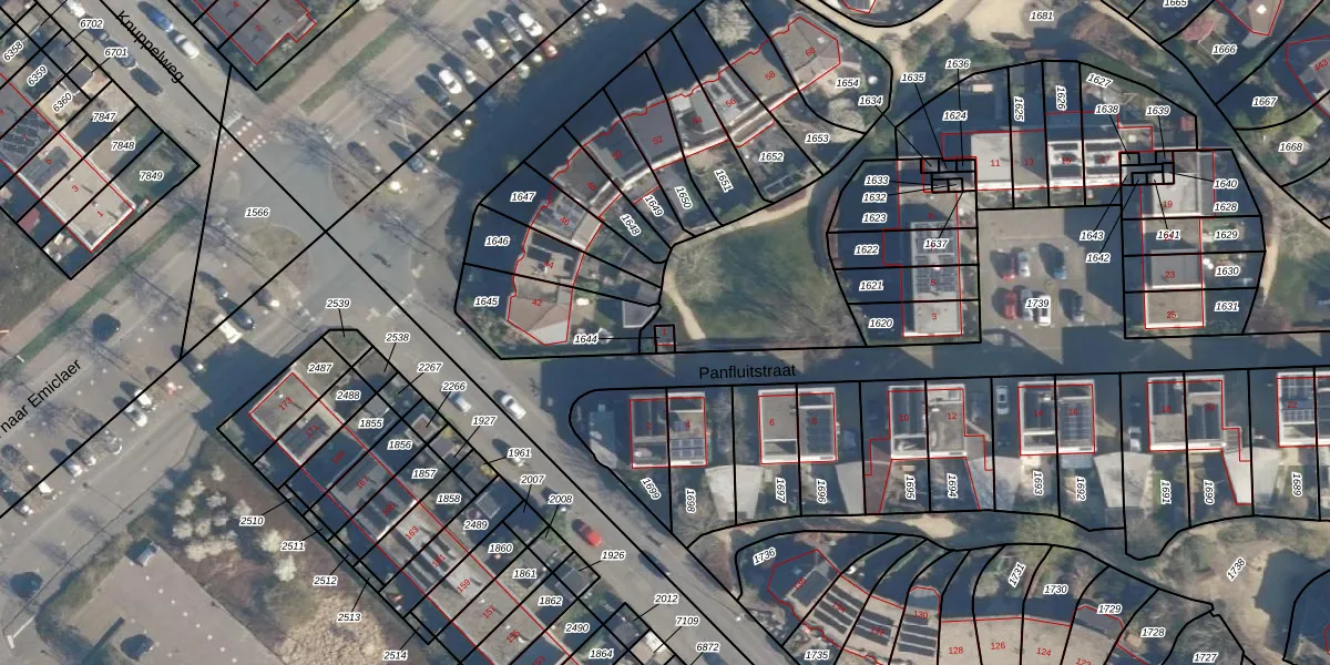Panfluitstraat 1 is gelegen op kadastraal perceel AMF00N1644. Deze kadastrale aanduiding is uniek en wordt gebruikt door het Kadaster om eigendomsrechten en andere zakelijke rechten vast te leggen. Het perceel maakt onderdeel uit van de kadastrale gemeente Amersfoort.