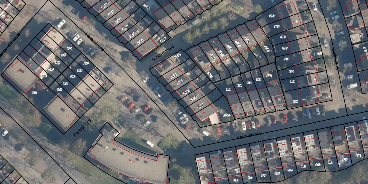 Parnaskruid 34 is gelegen op kadastraal perceel AMF00P2569. Deze kadastrale aanduiding is uniek en wordt gebruikt door het Kadaster om eigendomsrechten en andere zakelijke rechten vast te leggen. Het perceel maakt onderdeel uit van de kadastrale gemeente Amersfoort.