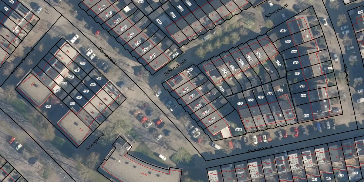 Parnaskruid 38 is gelegen op kadastraal perceel AMF00P2571. Deze kadastrale aanduiding is uniek en wordt gebruikt door het Kadaster om eigendomsrechten en andere zakelijke rechten vast te leggen. Het perceel maakt onderdeel uit van de kadastrale gemeente Amersfoort.