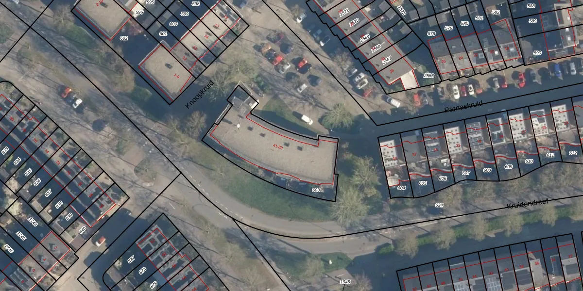 Parnaskruid 41 is gelegen op kadastraal perceel AMF00P603. Deze kadastrale aanduiding is uniek en wordt gebruikt door het Kadaster om eigendomsrechten en andere zakelijke rechten vast te leggen. Het perceel maakt onderdeel uit van de kadastrale gemeente Amersfoort.