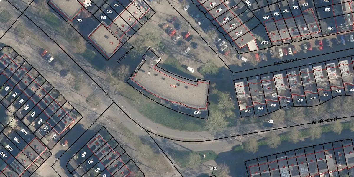 Parnaskruid 63 is gelegen op kadastraal perceel AMF00P603. Deze kadastrale aanduiding is uniek en wordt gebruikt door het Kadaster om eigendomsrechten en andere zakelijke rechten vast te leggen. Het perceel maakt onderdeel uit van de kadastrale gemeente Amersfoort.