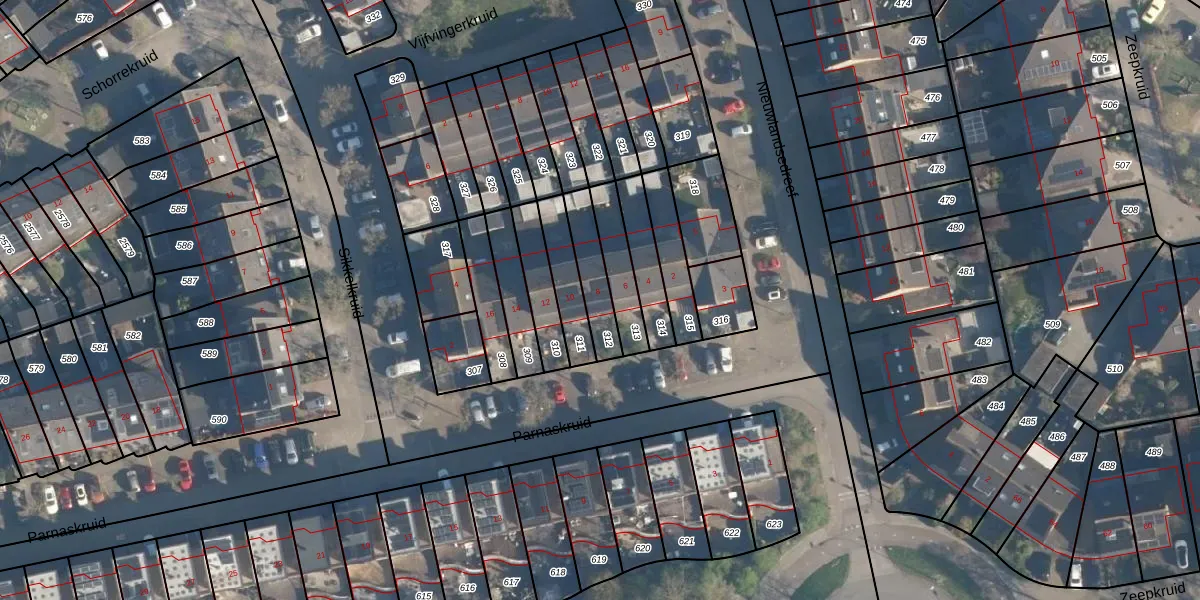 Parnaskruid 8 is gelegen op kadastraal perceel AMF00P312. Deze kadastrale aanduiding is uniek en wordt gebruikt door het Kadaster om eigendomsrechten en andere zakelijke rechten vast te leggen. Het perceel maakt onderdeel uit van de kadastrale gemeente Amersfoort.