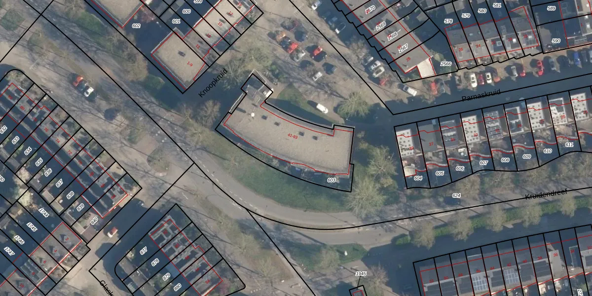Parnaskruid 83 is gelegen op kadastraal perceel AMF00P603. Deze kadastrale aanduiding is uniek en wordt gebruikt door het Kadaster om eigendomsrechten en andere zakelijke rechten vast te leggen. Het perceel maakt onderdeel uit van de kadastrale gemeente Amersfoort.