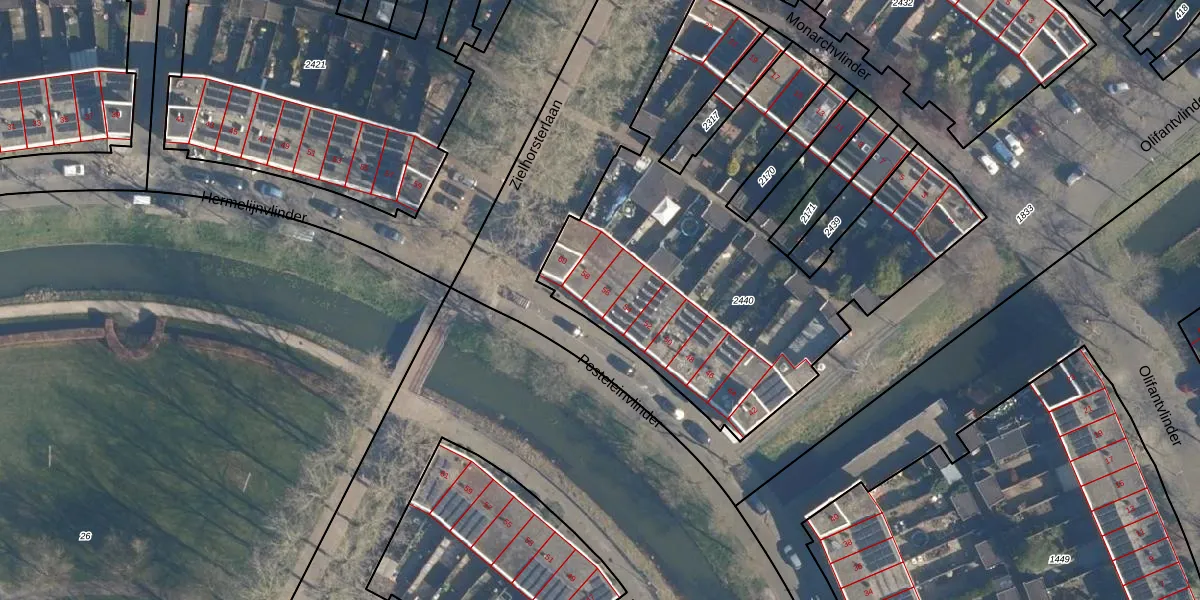 Het perceel waarop Posteleinvlinder 56 staat heeft een oppervlakte van 2390 m². Dit is een zeer groot perceel. De perceeloppervlakte wordt geregistreerd door het Kadaster. Gedetailleerde informatie over de maten van dit perceel kunt u vinden in het rapport Kadastrale kaart met maatvoering van Posteleinvlinder 56.