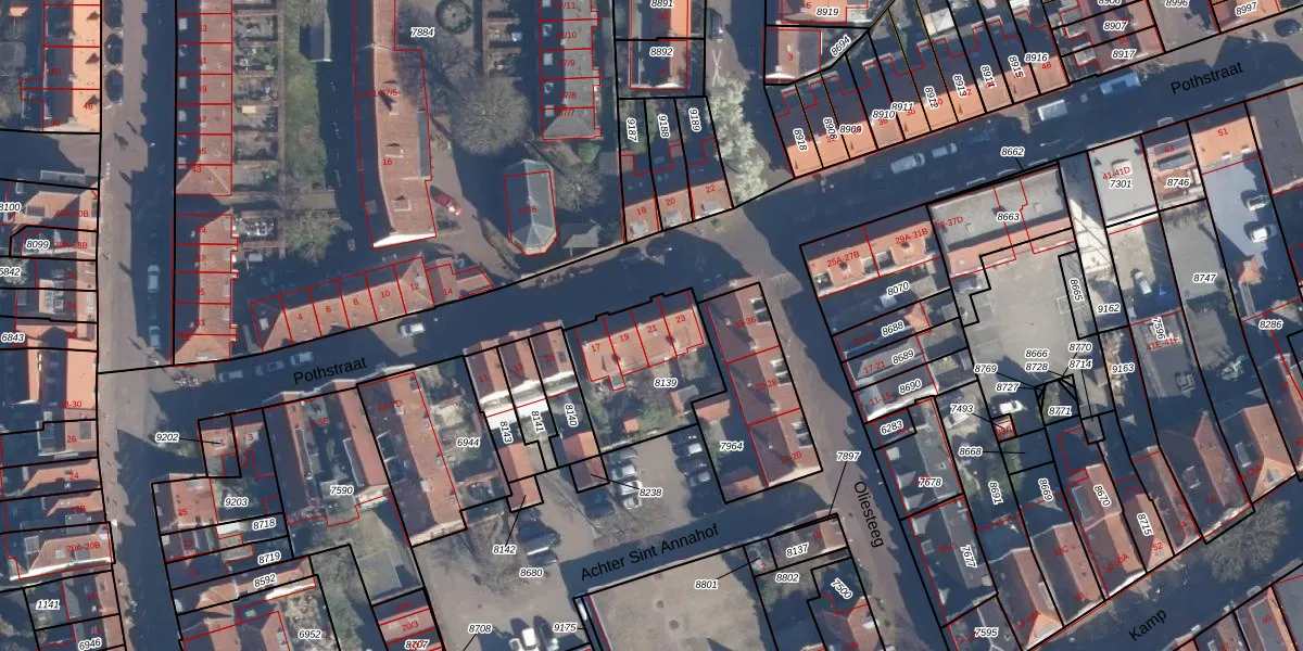 Het perceel waarop Pothstraat 21 staat heeft een oppervlakte van 404 m². Dit is een groot perceel. De perceeloppervlakte wordt geregistreerd door het Kadaster. Gedetailleerde informatie over de maten van dit perceel kunt u vinden in het rapport Kadastrale kaart met maatvoering van Pothstraat 21.