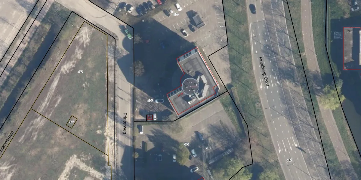Het perceel waarop Printerweg 24 staat heeft een oppervlakte van 7120 m². Dit is een zeer groot perceel. De perceeloppervlakte wordt geregistreerd door het Kadaster. Gedetailleerde informatie over de maten van dit perceel kunt u vinden in het rapport Kadastrale kaart met maatvoering van Printerweg 24.
