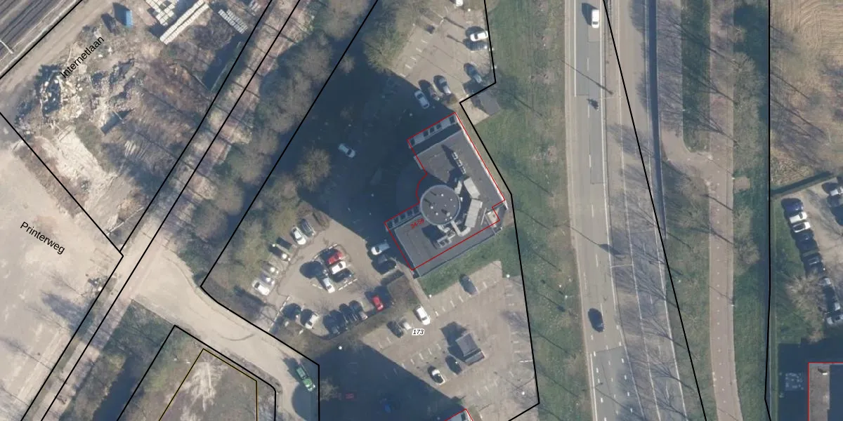 Het perceel waarop Printerweg 46 staat heeft een oppervlakte van 7120 m². Dit is een zeer groot perceel. De perceeloppervlakte wordt geregistreerd door het Kadaster. Gedetailleerde informatie over de maten van dit perceel kunt u vinden in het rapport Kadastrale kaart met maatvoering van Printerweg 46.