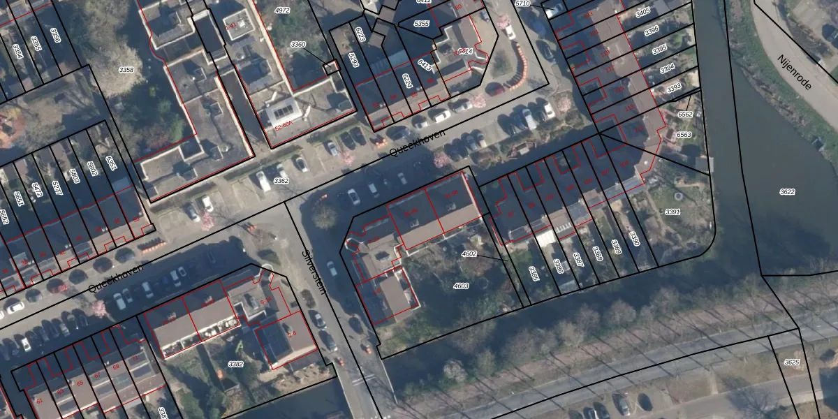 Het perceel waarop Queekhoven 87 staat heeft een oppervlakte van 1221 m². Dit is een zeer groot perceel. De perceeloppervlakte wordt geregistreerd door het Kadaster. Gedetailleerde informatie over de maten van dit perceel kunt u vinden in het rapport Kadastrale kaart met maatvoering van Queekhoven 87.