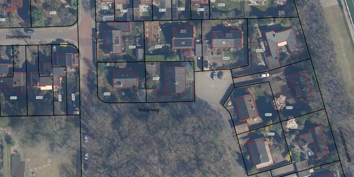 Het perceel waarop Robijnweg 2 staat heeft een oppervlakte van 631 m². Dit is een groot perceel. De perceeloppervlakte wordt geregistreerd door het Kadaster. Gedetailleerde informatie over de maten van dit perceel kunt u vinden in het rapport Kadastrale kaart met maatvoering van Robijnweg 2.