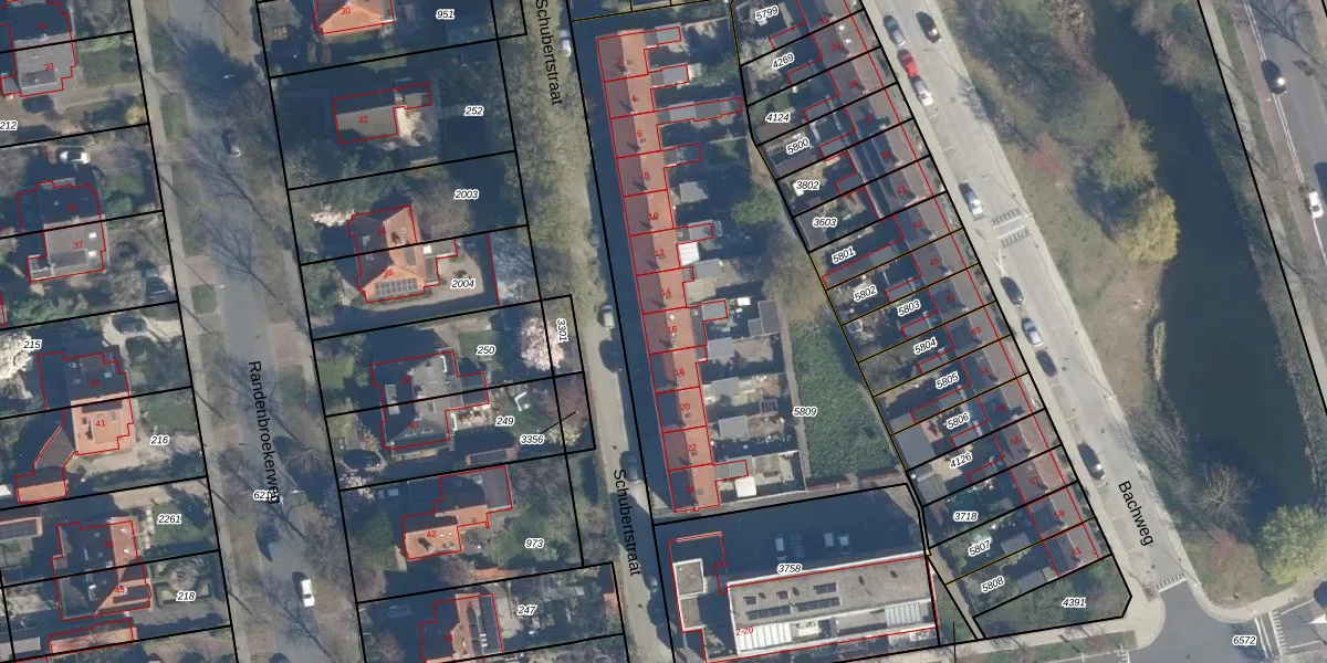 Het perceel waarop Schubertstraat 16 staat heeft een oppervlakte van 2312 m². Dit is een zeer groot perceel. De perceeloppervlakte wordt geregistreerd door het Kadaster. Gedetailleerde informatie over de maten van dit perceel kunt u vinden in het rapport Kadastrale kaart met maatvoering van Schubertstraat 16.
