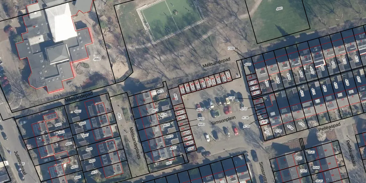 Het perceel waarop Simsonplein 3-10 staat heeft een oppervlakte van 18 m². Dit is een klein perceel. De perceeloppervlakte wordt geregistreerd door het Kadaster. Gedetailleerde informatie over de maten van dit perceel kunt u vinden in het rapport Kadastrale kaart met maatvoering van Simsonplein 3-10.